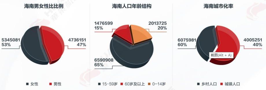 ?性別比例上,男性人口為5345081人,占53.02%;女性人口為4736151人,占46.98%。總人口性別比(以女性為100,男性對女 性的比例)為112.86,出生人口性別比為122.38,較2010年下降3.11,海南省人口性別結構持續改善。