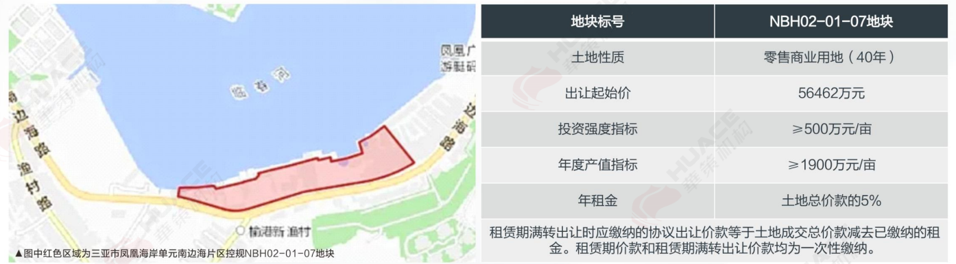 2021年5月27日,三亞市自然資源和規劃局發布2021年第16號土地出讓公告,將采取“先租后讓”方式供應位于鳳凰海岸單元南邊 海片區控規NBH02-01-07地塊一一“先租后讓”的租賃年限為5年,后續出讓年期為35年;掛牌岀讓起始價為56462萬元。
