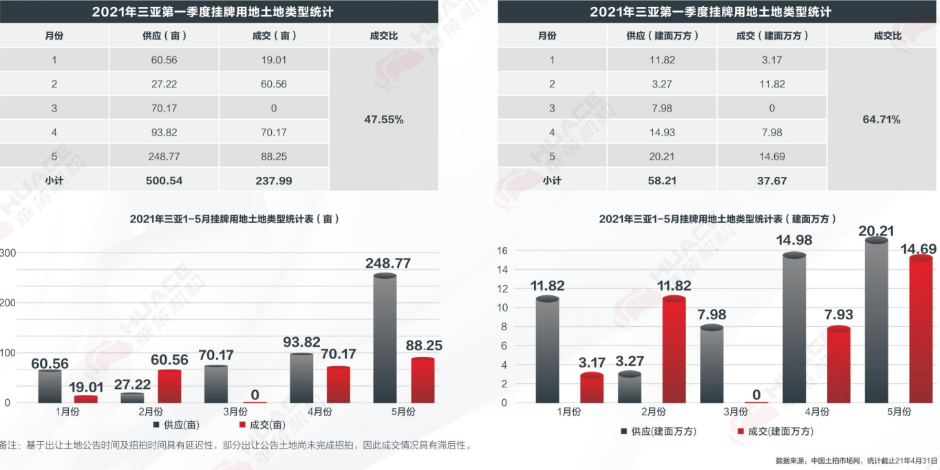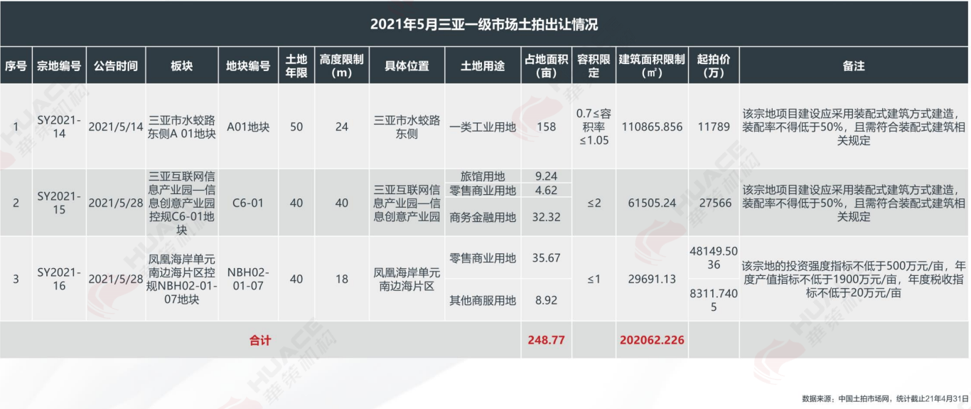 2021年5月份,三亞供應土地3宗,1宗工業用地,2宗商業用地。