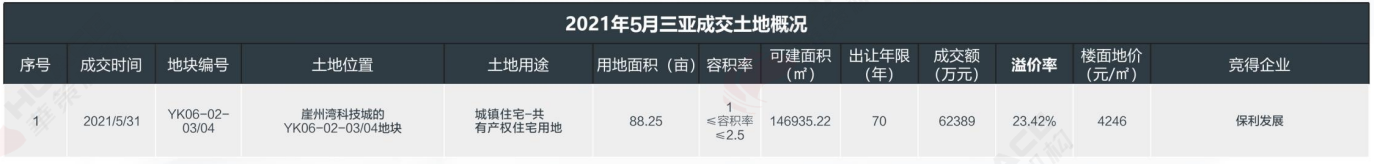 5月三亞成交1宗土地,共計88.25畝,成交金額約6.24億,位于崖州區,由保利發展競得,為城鎮住宅用地(共有產權),該宗地將用于建設安居型商品住房,建成后銷售價格為12800元/m2。