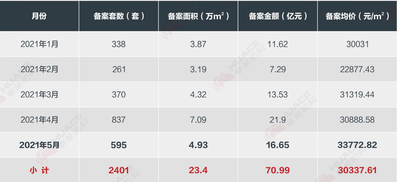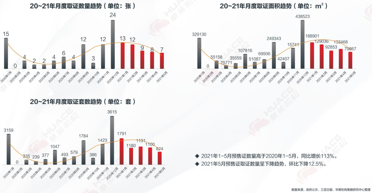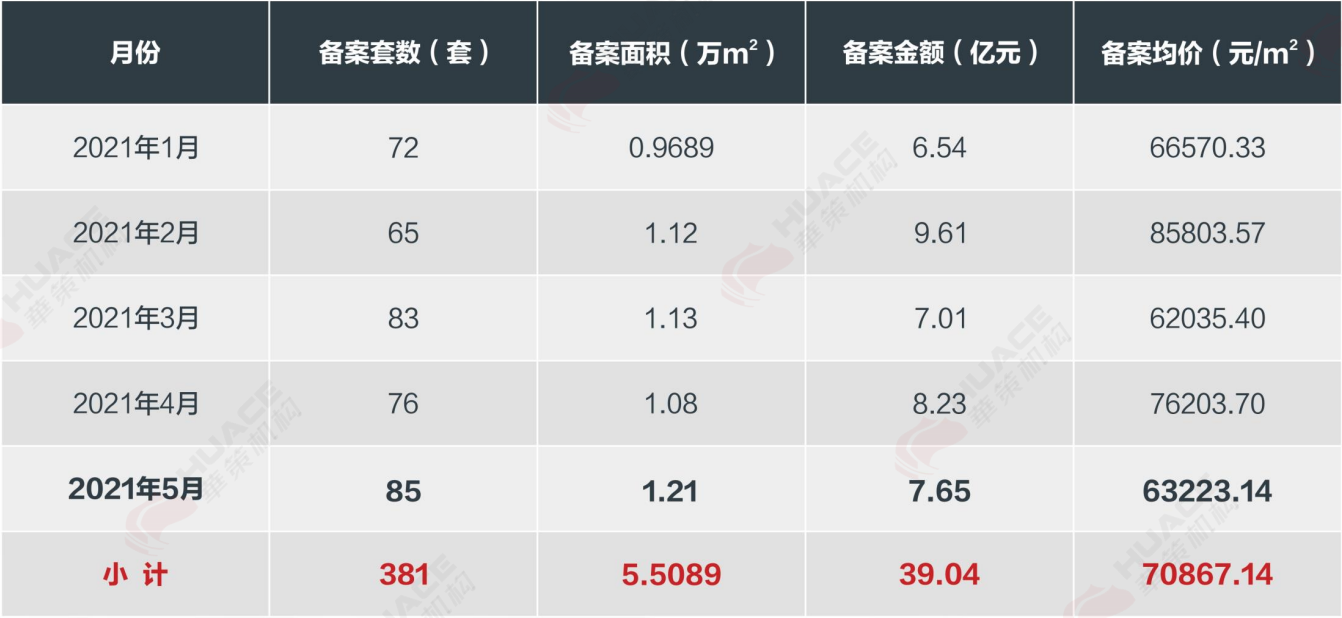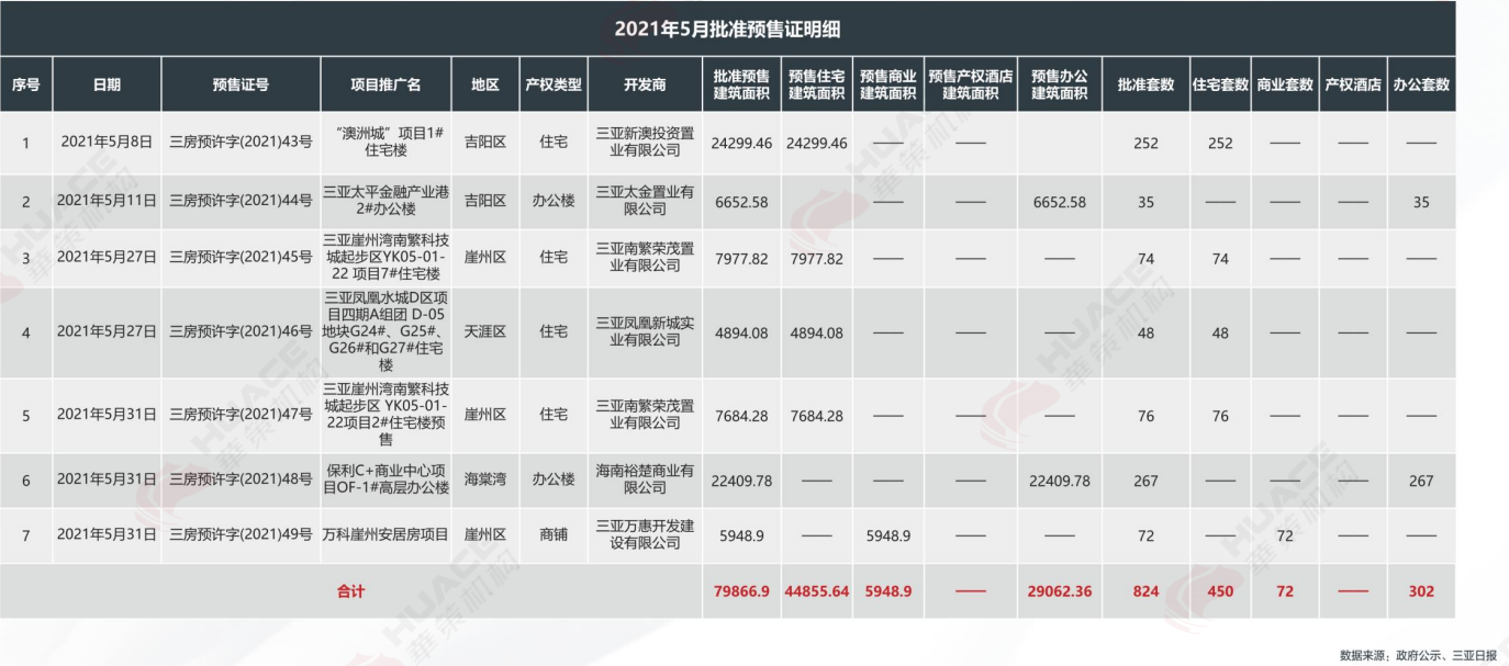 2021年5月批準預售證7張,其中住宅450套、辦公產品302套,商業72套,產權式酒店本月無新増。