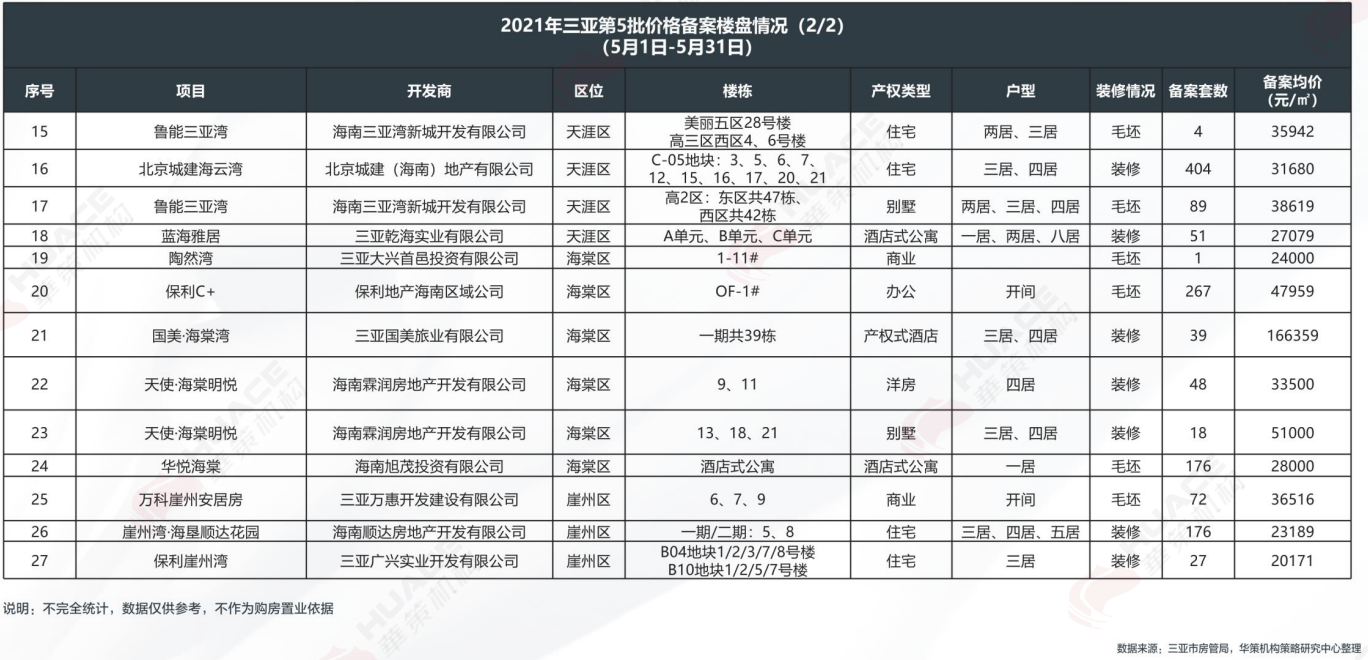 價格備案:2021年5月三亞價格備案樓盤22個,共3320套房